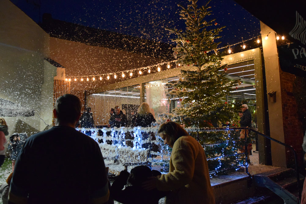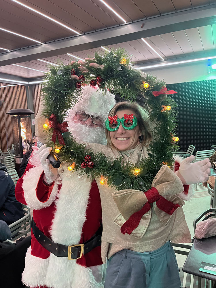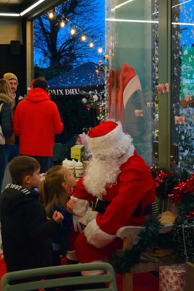 Les enfants prennent des photos avec le Père Noël, jouent avec la neige au pied du sapin pendant que les parents profitent de vin chaud, de crêpes, de gaufres,... dans une ambiance chaleureuse.